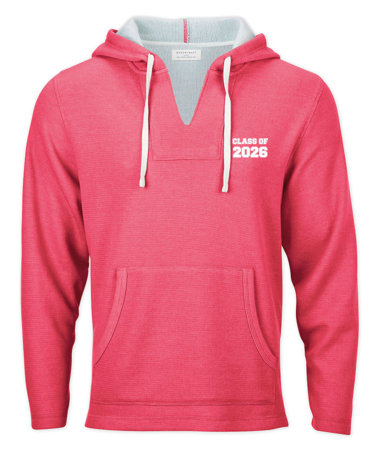 Join us in celebrating the Class of 2026! Stay in tune with your casual vibe with the Baja Fleece Pullover. Soft poly fleece has a self-placket that is seamed on top with raw edges for a more natural look. With flat, natural braided drawcords and a 1-ply, 2-piece hood. Back neck tape adds durability, and the kanga pocket keeps hands warm. Side vents add a bit of flexibility.