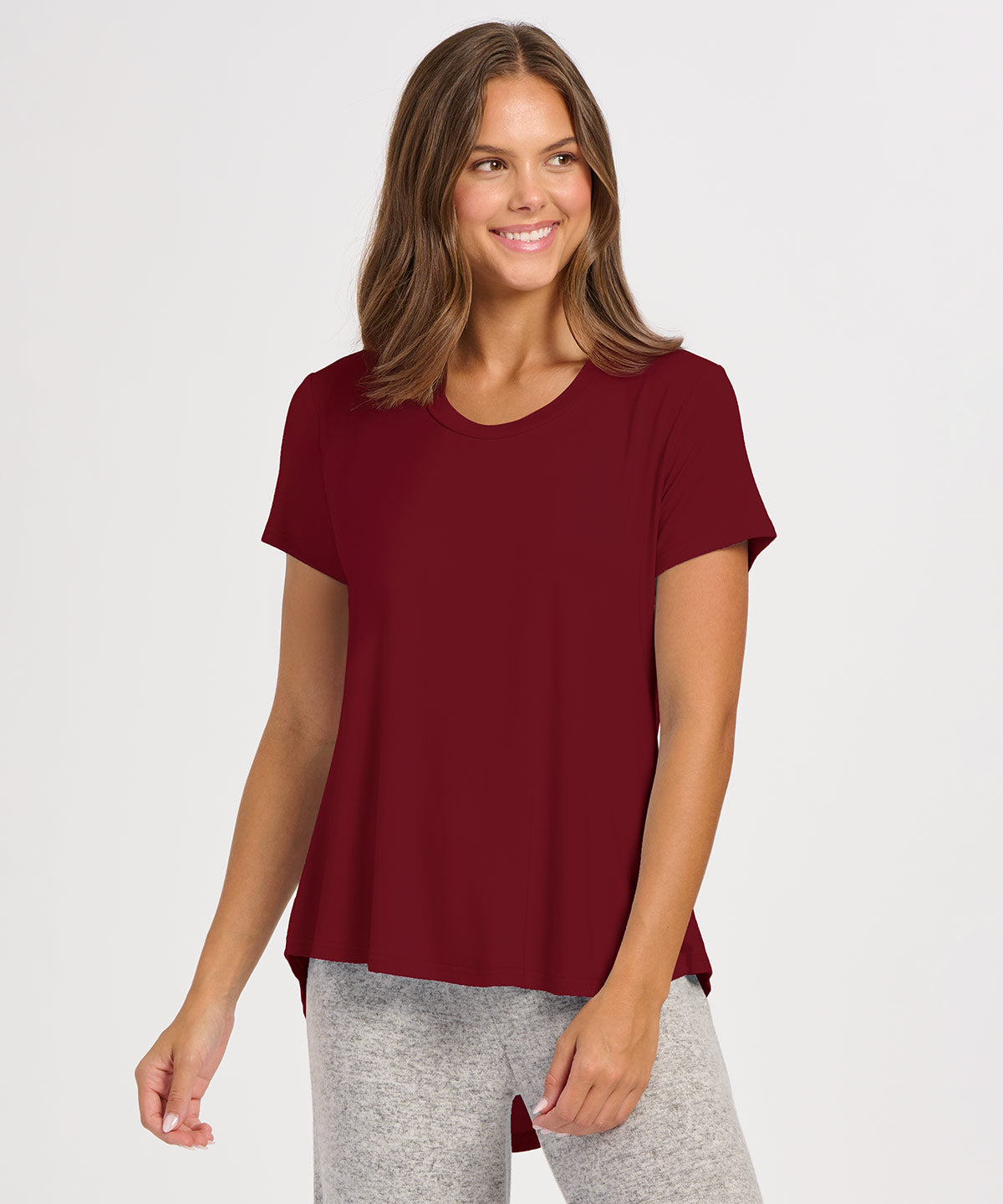 You'll love the luxuriously soft feel and look of this bamboo tee shirt. The loose fit style is perfected with just the right amount of stretch. A satin neck trim on the scoop neckline and a hi/low hem take it from basic to basically every day!