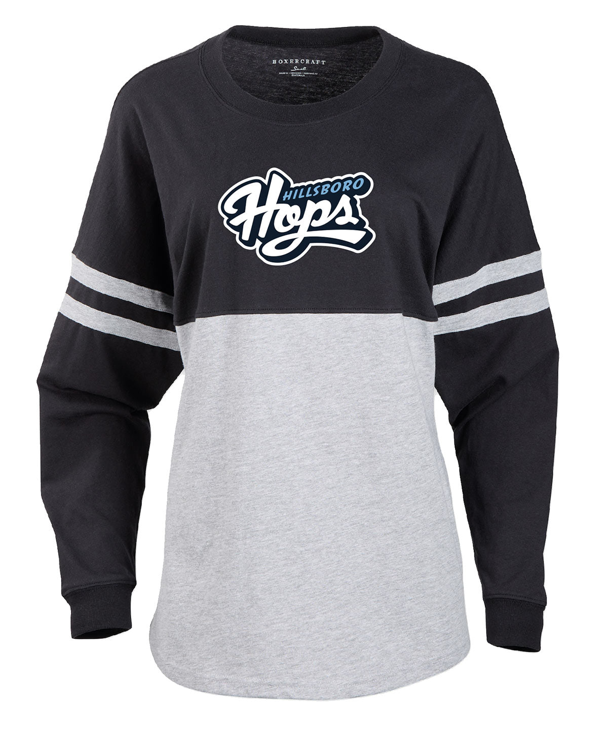 Give a loud cheer for your new favorite jersey. With double stripes on sleeves for athletic style, and a roomy, oversized fit for extra comfort, this all-cotton jersey is a winning look, layered or not. Rib knit at cuffs and crewneck. Lift up your team spirit in our long-sleeve Pom Pom Jersey.
